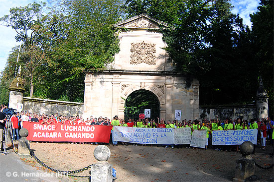 Unas 300 trabajadores de Golden Line y Sniace se han concentrado hoy frente a la Finca de Botín, para pedir al banquero cántabro «que haga algo por su tierra». La plantilla de Golden Line ha recordado que el Banco Santander es el accionista mayoritario de Konecta, la empresa que les ha subrogado y quiere imponer a sus 150 trabajadores «un despido encubierto como traslado», mientras que la de Sniace, además de apoyar a sus compañeros del call center, han recordado a las autoridades que todavía es posible «revertir» el despido de las 533 personas de la fábrica torrelaveguense.