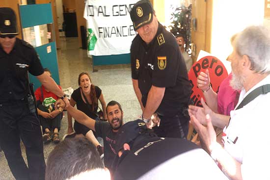 La policía intentó en un momento dado desalojar a los ocupantes, pero algunos de ellos se encadenaron en el interior de la entidad y el resto se sentó en el suelo de la oficina, oponiendo una resistencia pasiva al intento de los agentes de sacarlos al exterior. Finalmente los agentes desistieron del desalojo y se limitaron a garantizar el acceso a los clientes del banco.