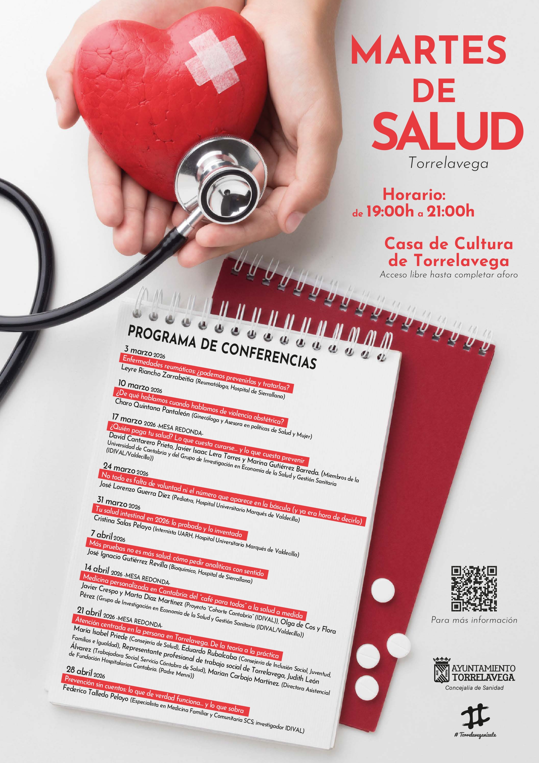 El 3 de marzo comenzará una nueva edición de las charlas ‘Martes de Salud’, que incluye nueve jornadas, a las 19.00 horas, en la Casa de Cultura de Torrelavega. En esta edición se han programado seis charlas y tres mesas redondas, con entrada libre.