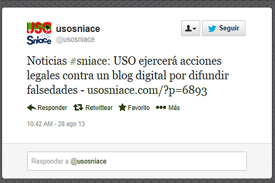 USO-Sniace ha difundido a través de una nota publicada en su web, en Facebook y en Twitter que estudia emprender acciones legales contra HoyTorrelavega por lo que califica de informaciones «falsas y tendenciosas» que no especifica, más allá de explicar que son «referidas a la asistencia a los actos que organizan tanto el comité de empresa de Golden Line como Sniace».