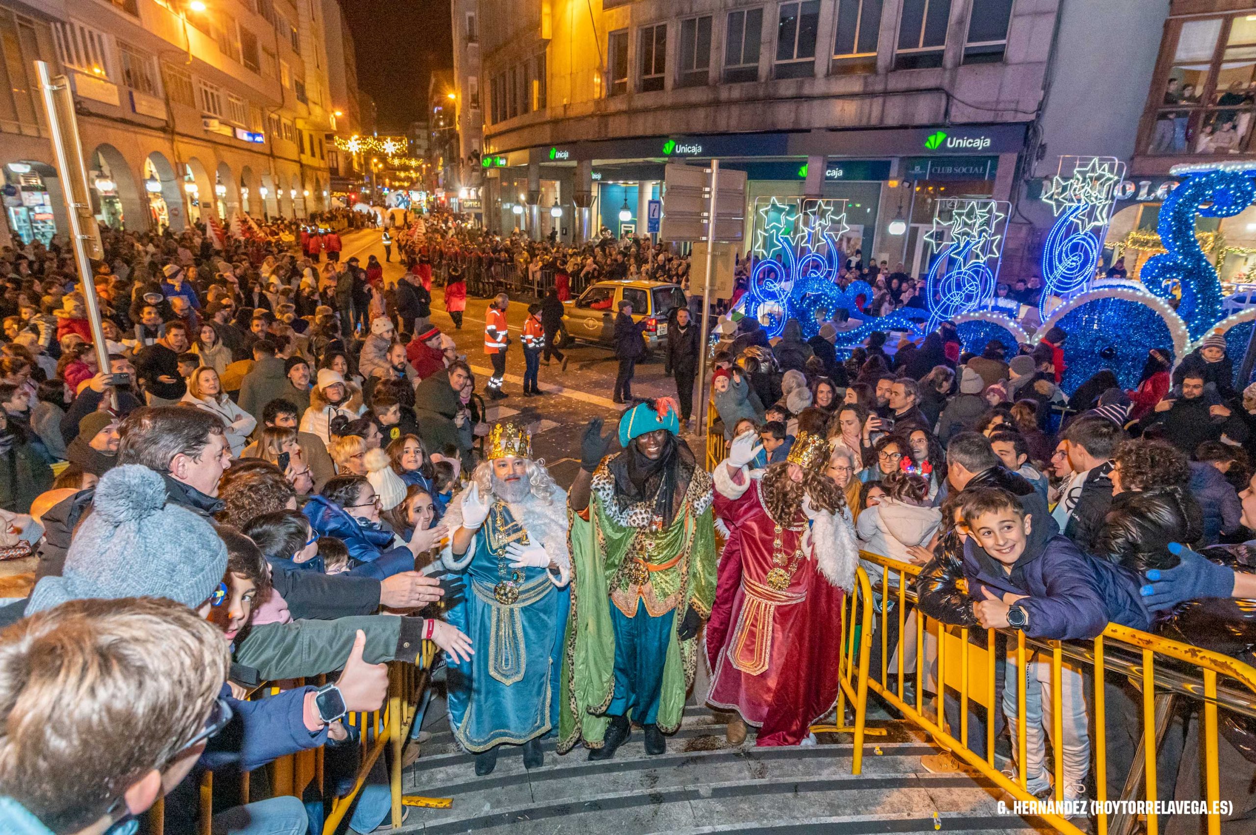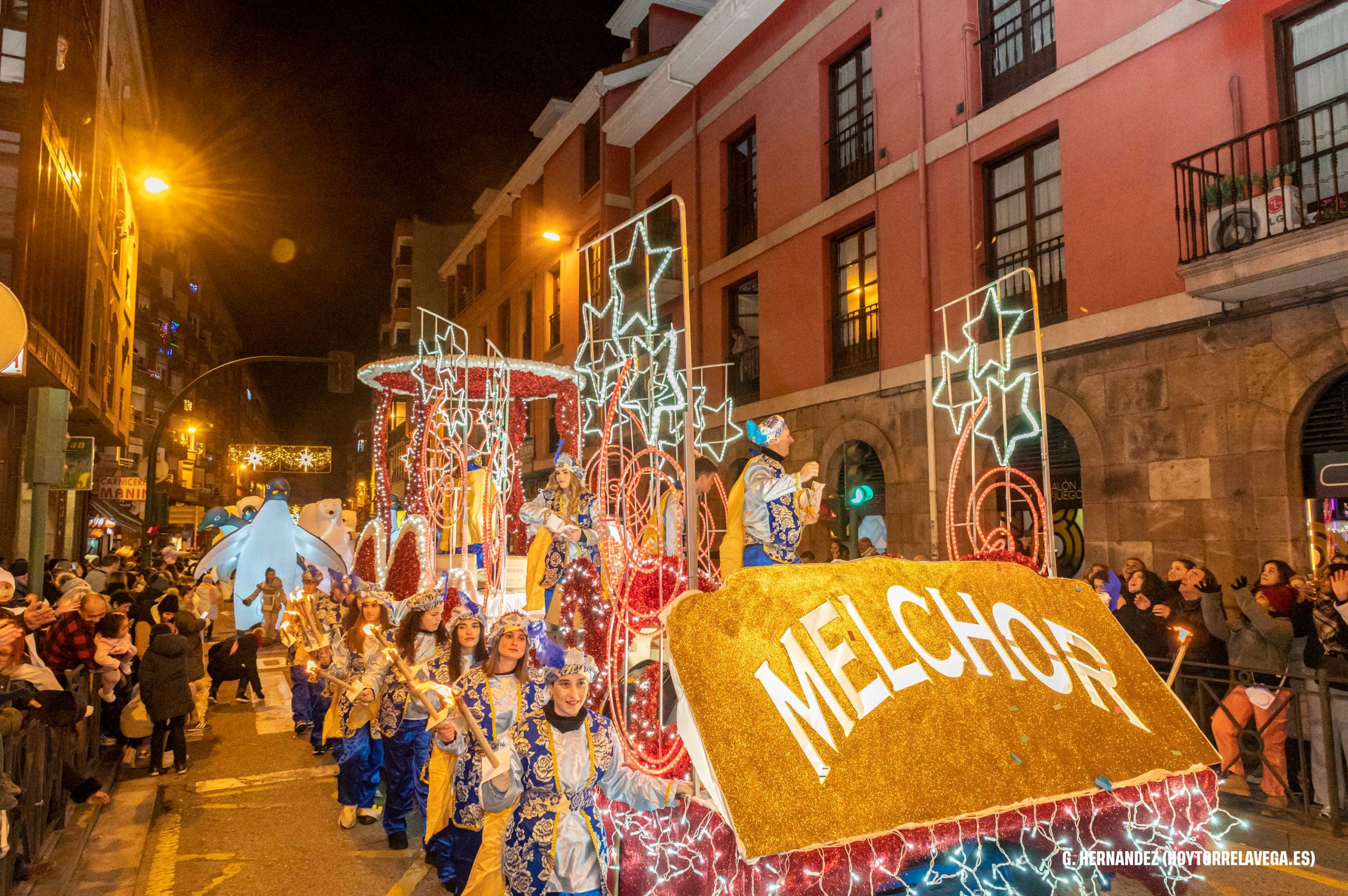 Los Reyes Magos han tenido un multitudinario recibimiento en su visita a Torrelavega, que ha llenado las calles del recorrido con niños y adultos compartiendo la ilusión de ver y saludar a Melchor, Gaspar y Baltasar. Sus Majestades han recorrido la ciudad con una comitiva formada por unas 300 personas y nueve espectáculos de gran formato.