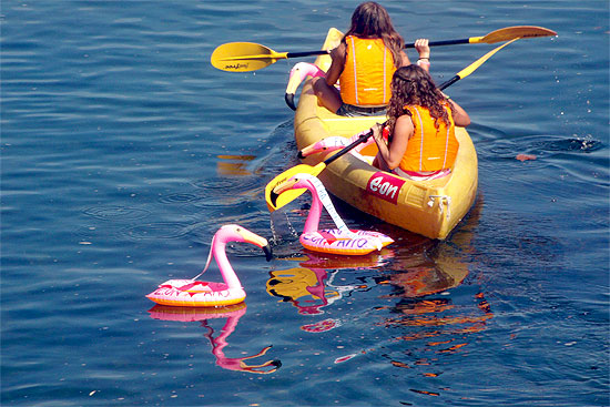 Los «flamencos protesta» arrojados al agua por los vecinos, flotaron junto a las canoas de la emrpesa Cantabria Activa en las que figuraba el nombre del patrocinador Eon. Los centenares de personas que tomaron parte en la actividad gratuita también vieron durante el descenso la pancarta colocada en el puente.