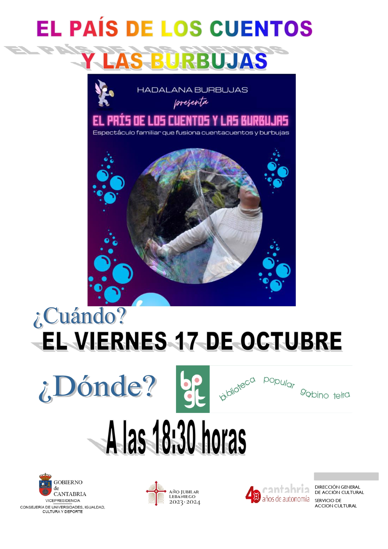 En Torrelavega la celebración en la Biblioteca Municipal Gabino Teira consiste en dos espectáculos infantiles gratuitos. El 17 de octubre, la biblioteca acogerá ‘El país de los cuentos y las burbujas’, un espectáculo familiar que combina cuentacuentos y magia con burbujas. Y el día 24 ‘El Niño Pez’, a cargo de la compañía Los Titiritinos. Ambos espectáculos serán a las 18.30 horas.